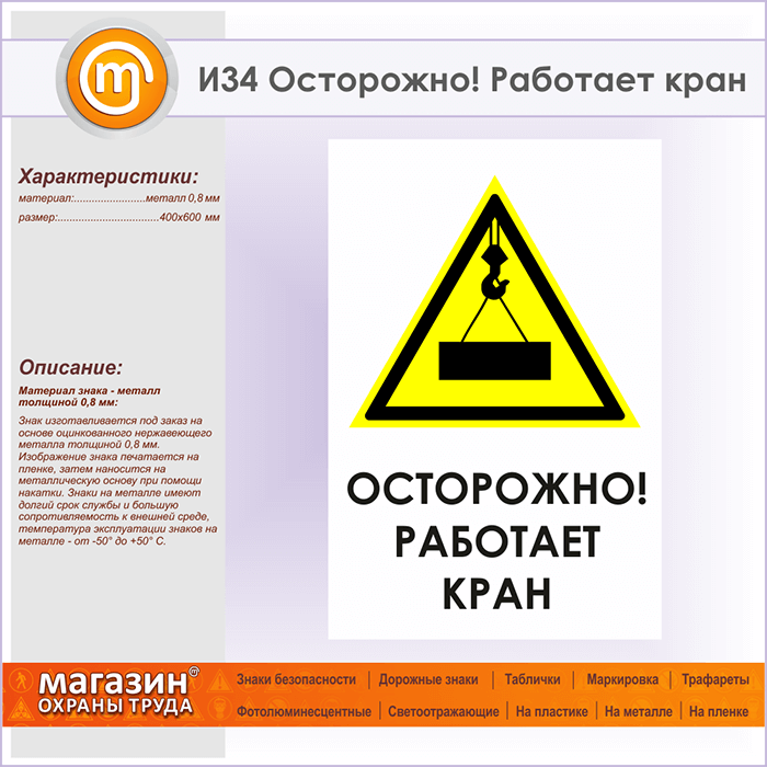 Знак «Осторожно! Работает кран», И34 (металл, 400х600 мм) в Кубинке купить
