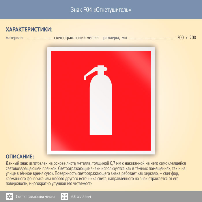 Знак F04 «Огнетушитель» (светоотражающий металл, 200х200 мм) в Кубинке купить